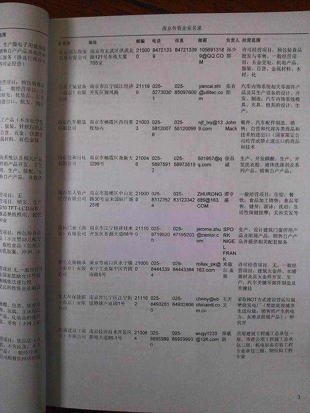 2021版最新南京企业黄页包括《南京制造企业黄页》、《南京贸易企业黄页》、《南京民营企业黄页》、《南京外资企业黄页》、《南京外贸企业黄页》共五册,现优惠价:280元/册。每册内容包括:单位名称、地址、邮编、电话、传真、邮箱、经营范围等;南京企业黄页涵盖了近几年来最新成立的、有一定规模的企业,具有非常高的营销价值。有了这套黄页开展业务也有了针对性,也省去了盲目去寻找客户名单而浪费的时间了,工作效率也会有很大的提高。欢迎需要南京企业黄页的朋友及时联系我们!
